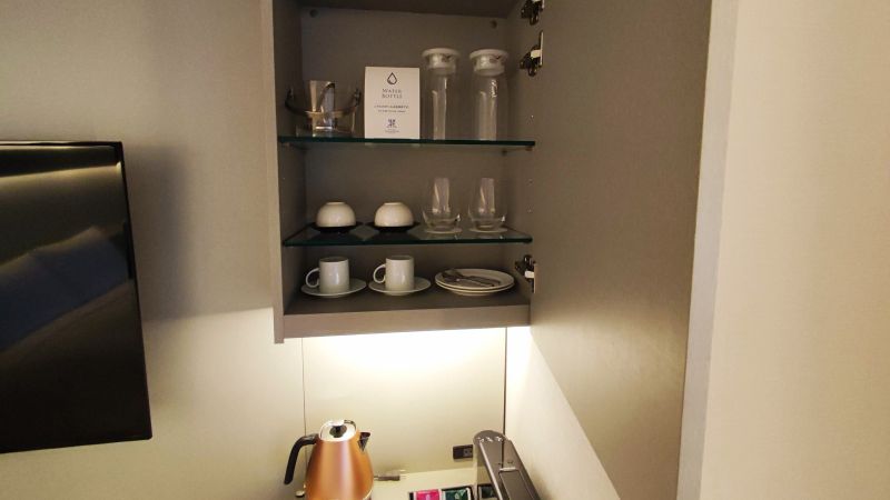 中を開けると、白く清潔感のある陶器のカップと上質なグラスが用意されていました。